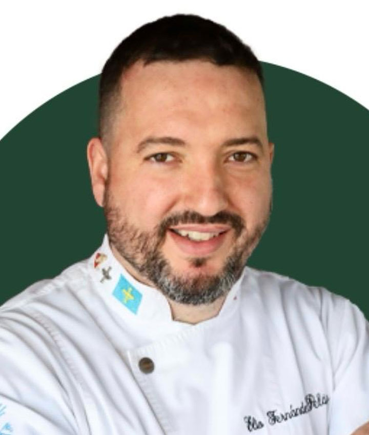 Chef asturiano con compromiso profundo hacia la gastronomía rural y el producto local. Su cocina fusiona tradición, creatividad y técnicas contemporáneas, siempre con fuerte arraigo en el entorno del occidente asturiano.